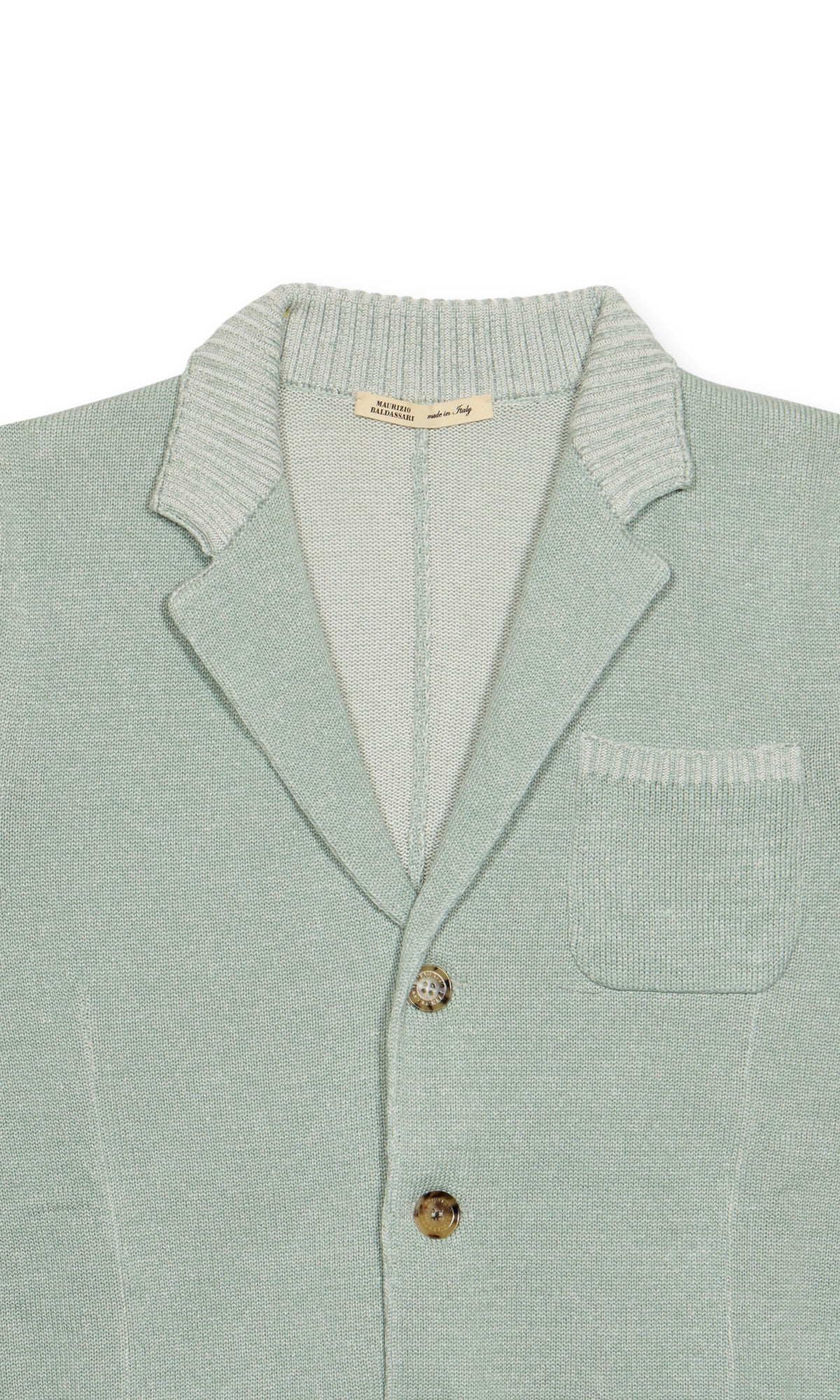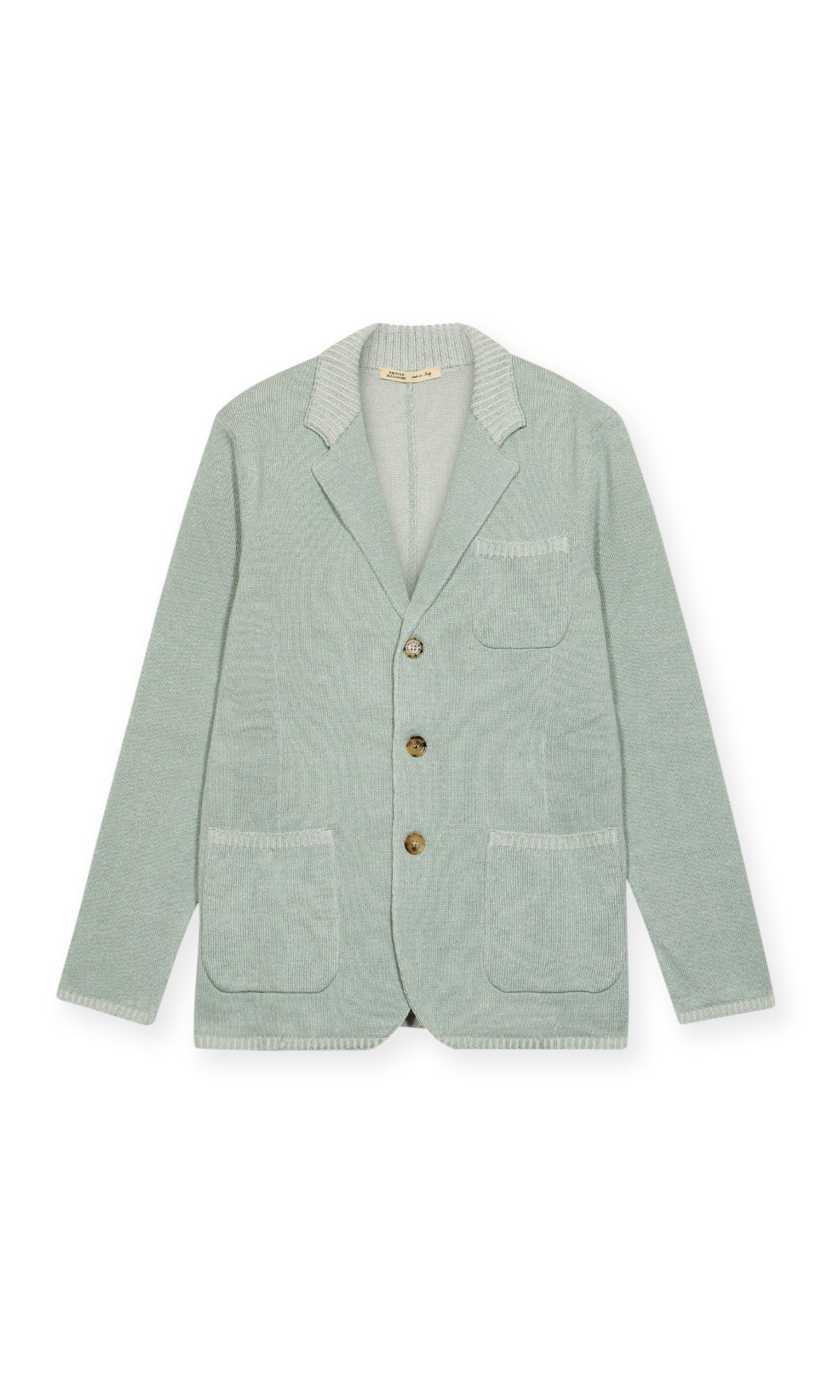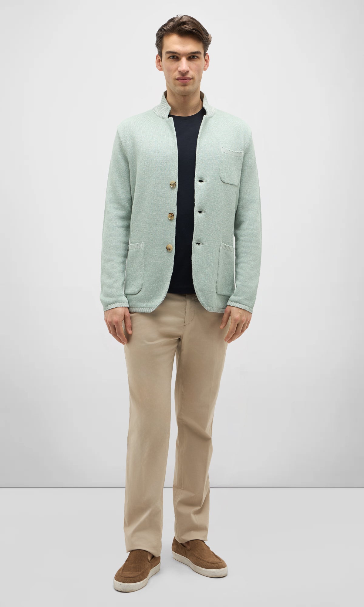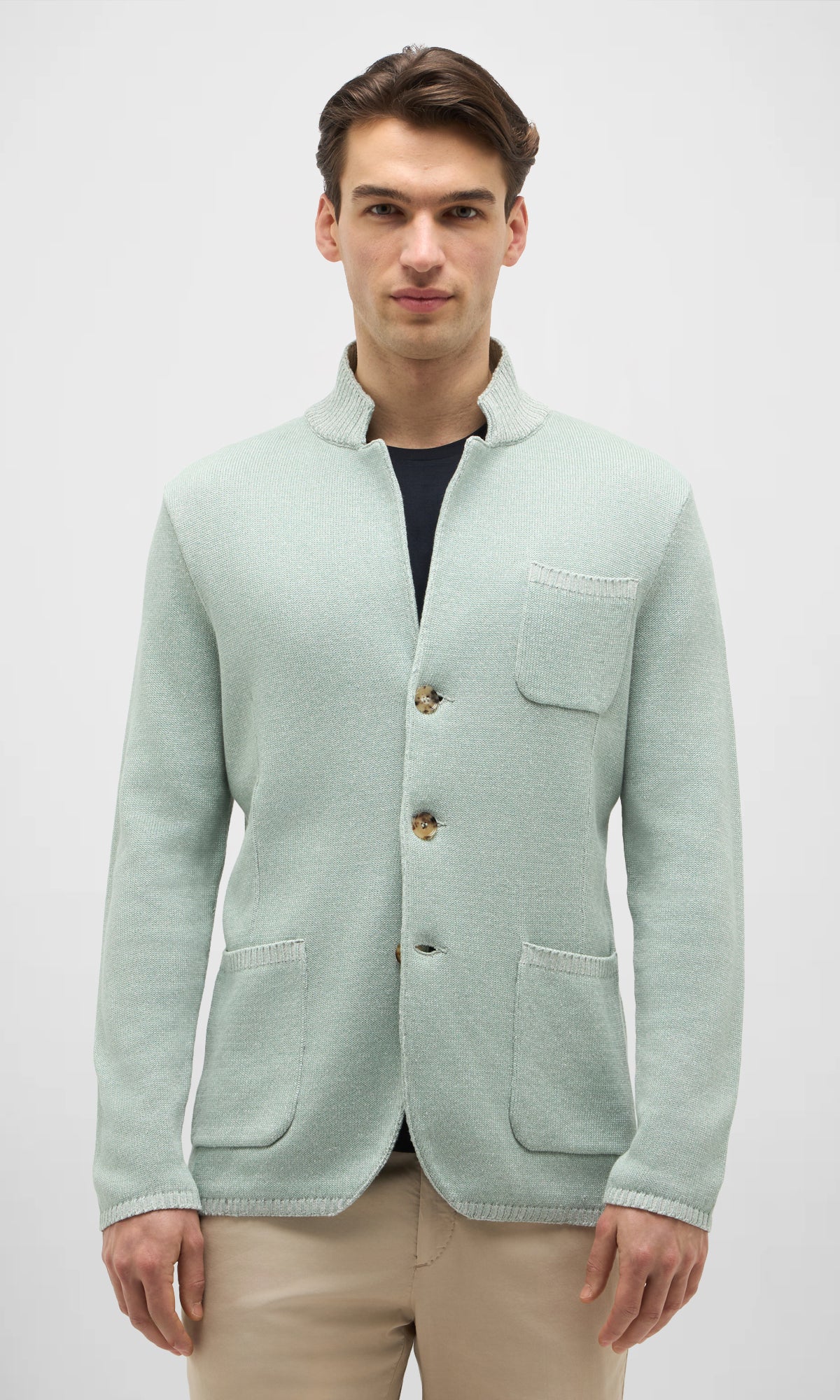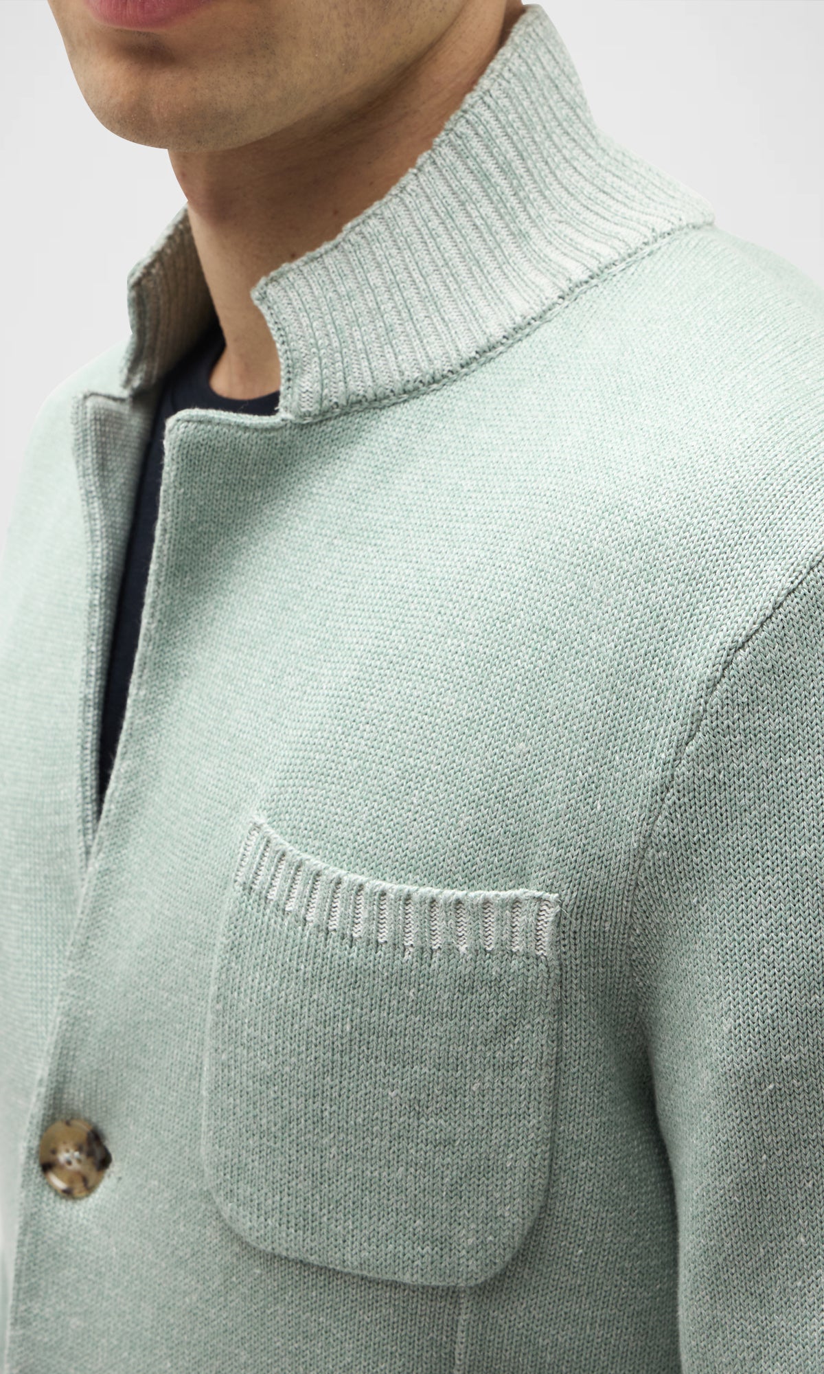 Swacket a tre bottoni in lino, cotone e seta, con collo in piedi e dettagli in costa, completato da due tasche applicate e da un taschino sul petto.