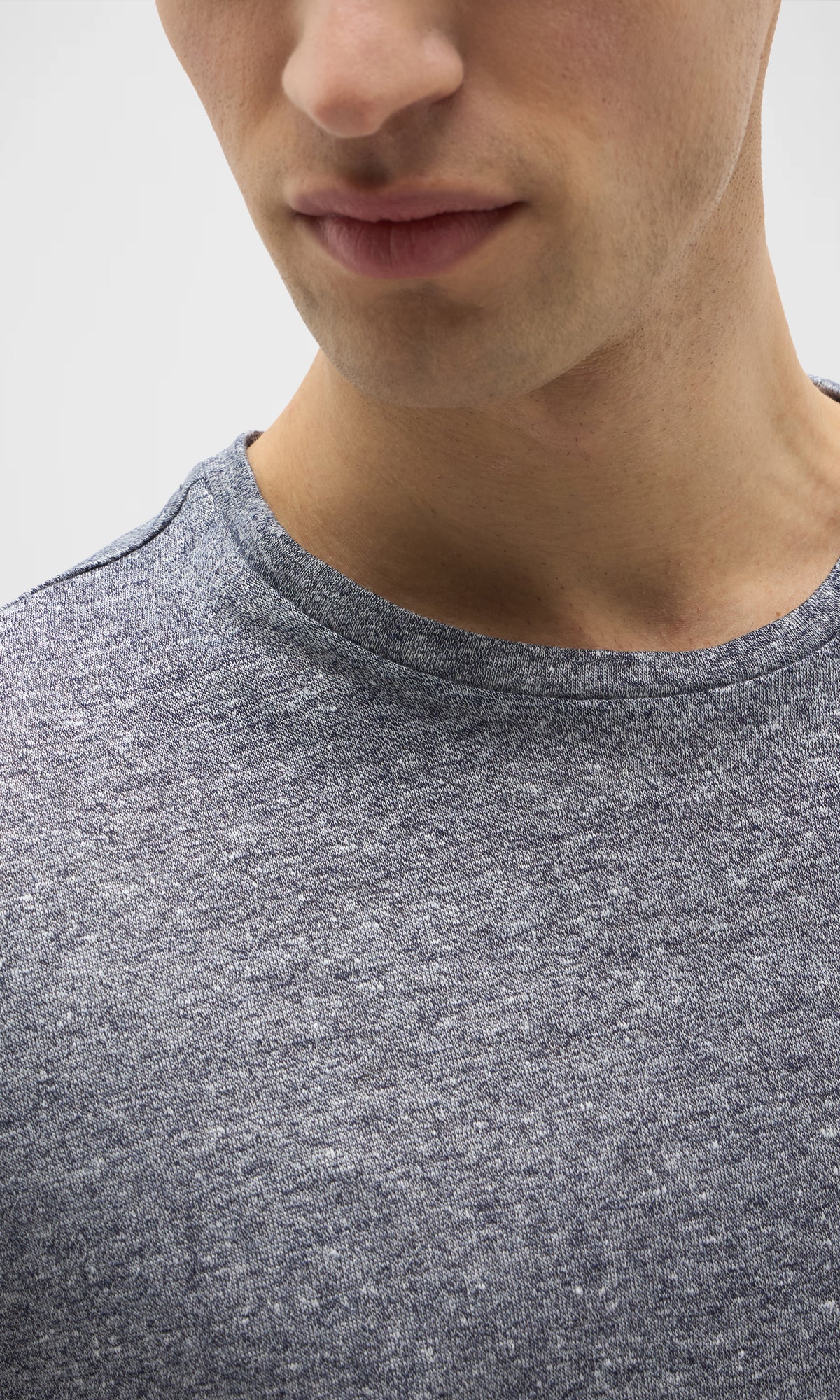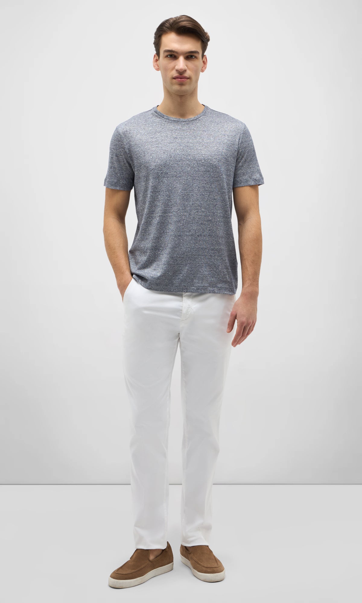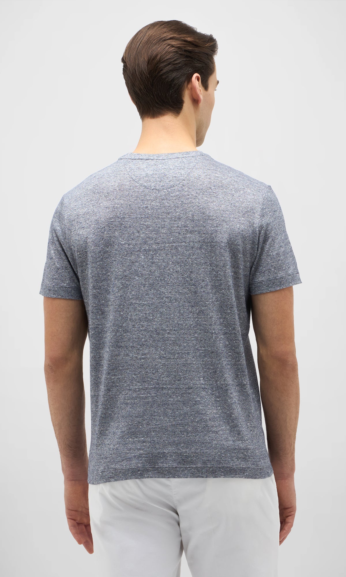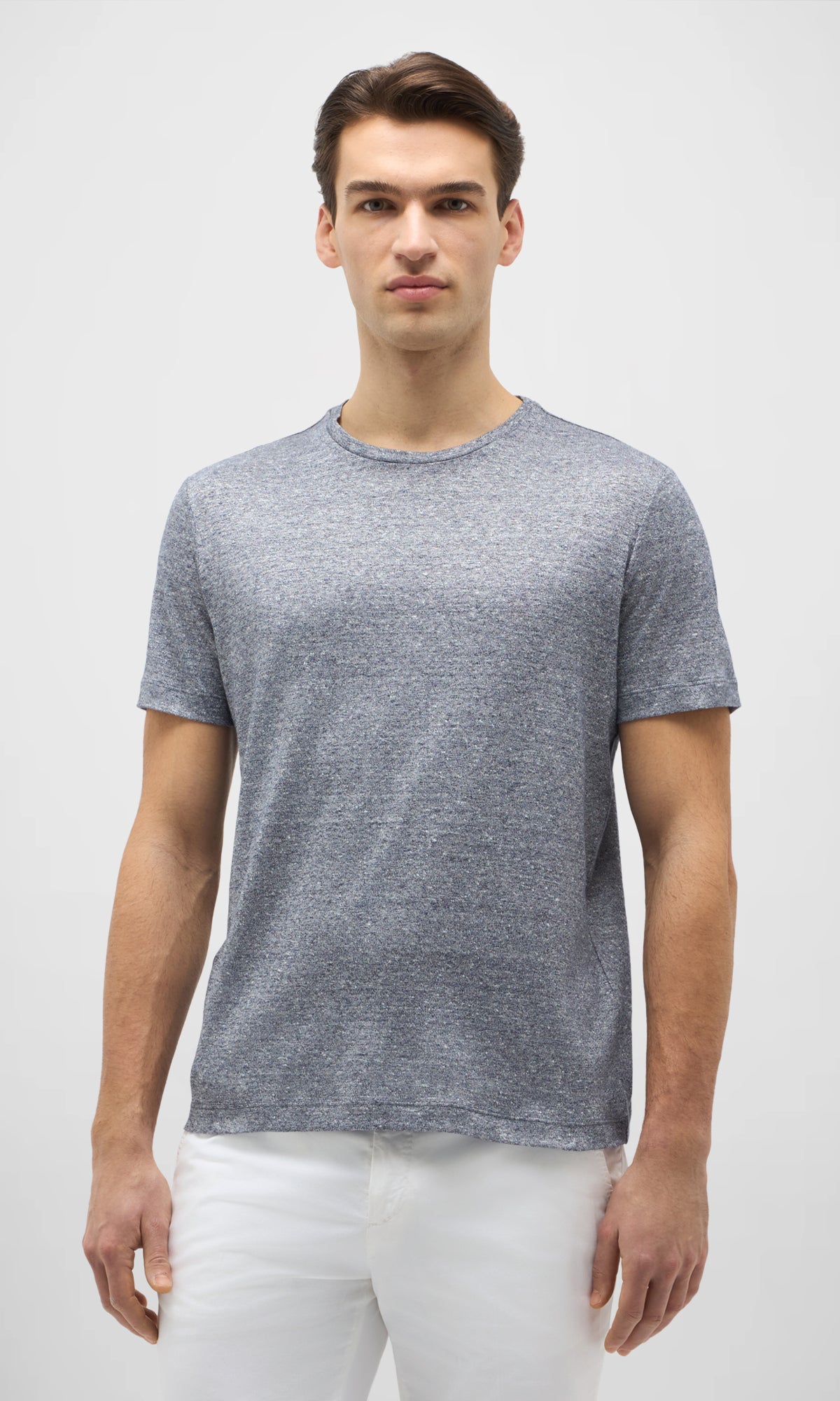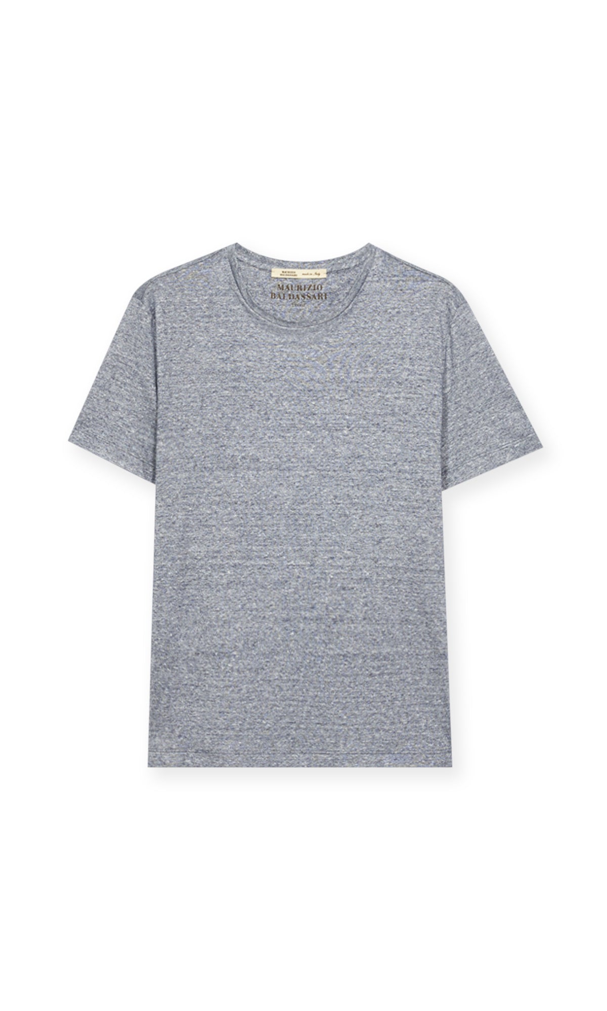 T-shirt realizzata in un pregiato tessuto misto lino e cotone, che unisce la freschezza naturale del lino alla morbidezza del cotone.