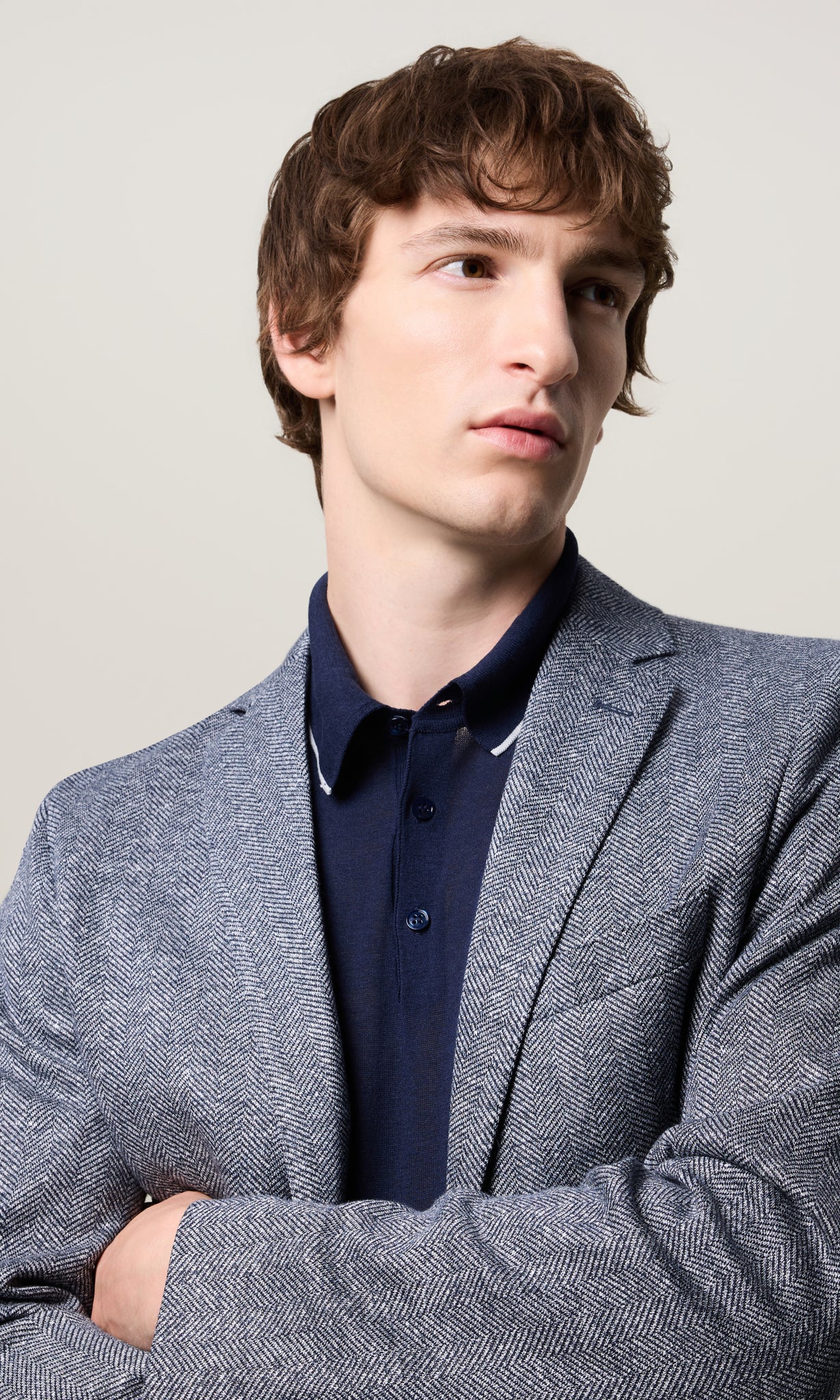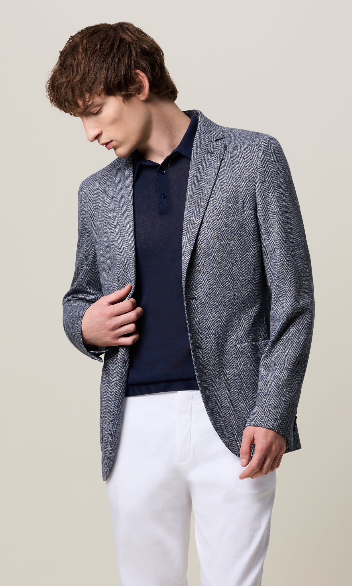 La trama spina di pesce, ottenuta dall’intreccio di due fili di colore diverso, conferisce al capo un carattere più informale e versatile.