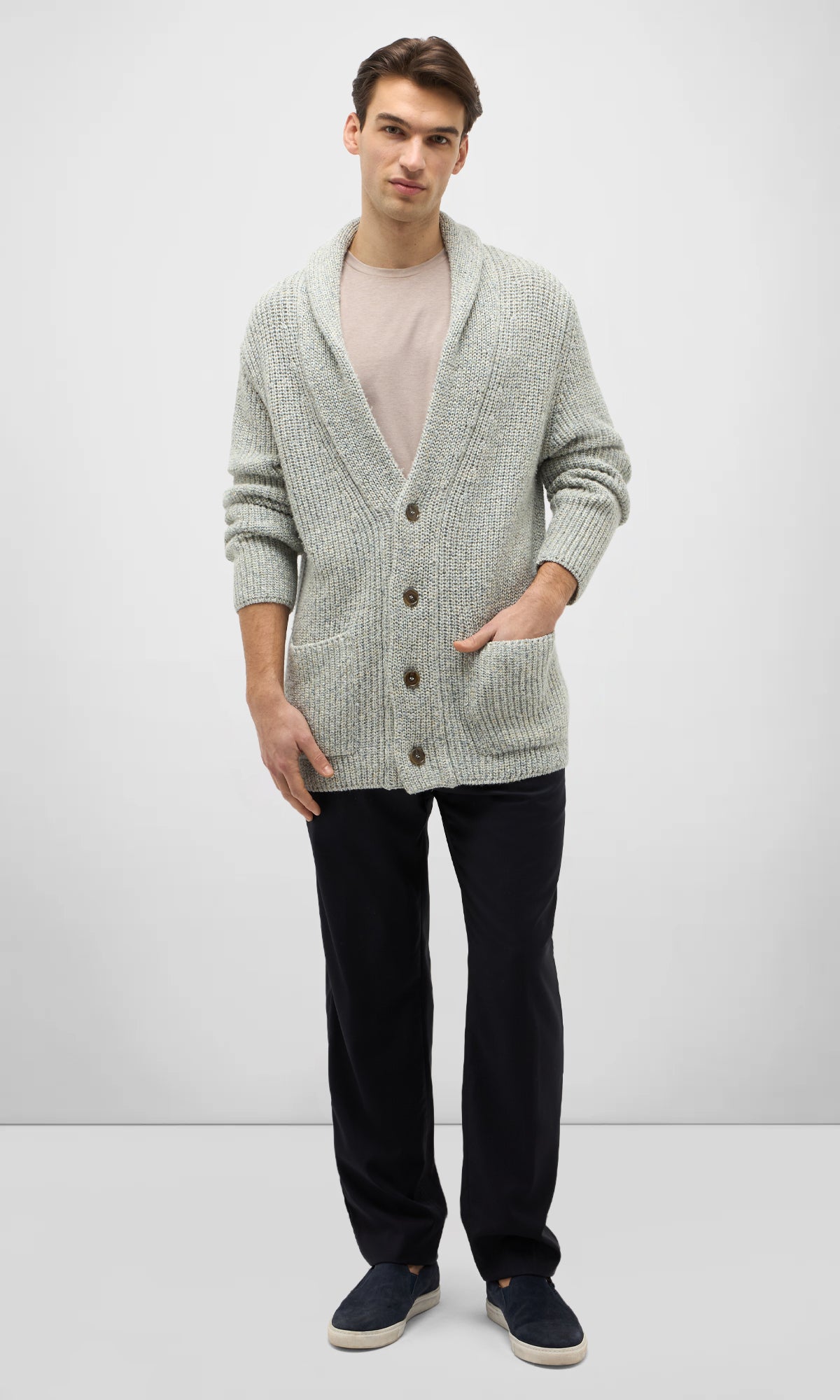 Il modello, con chiusura a quattro bottoni e tasche applicate, unisce struttura e morbidezza in un equilibrio sofisticato.