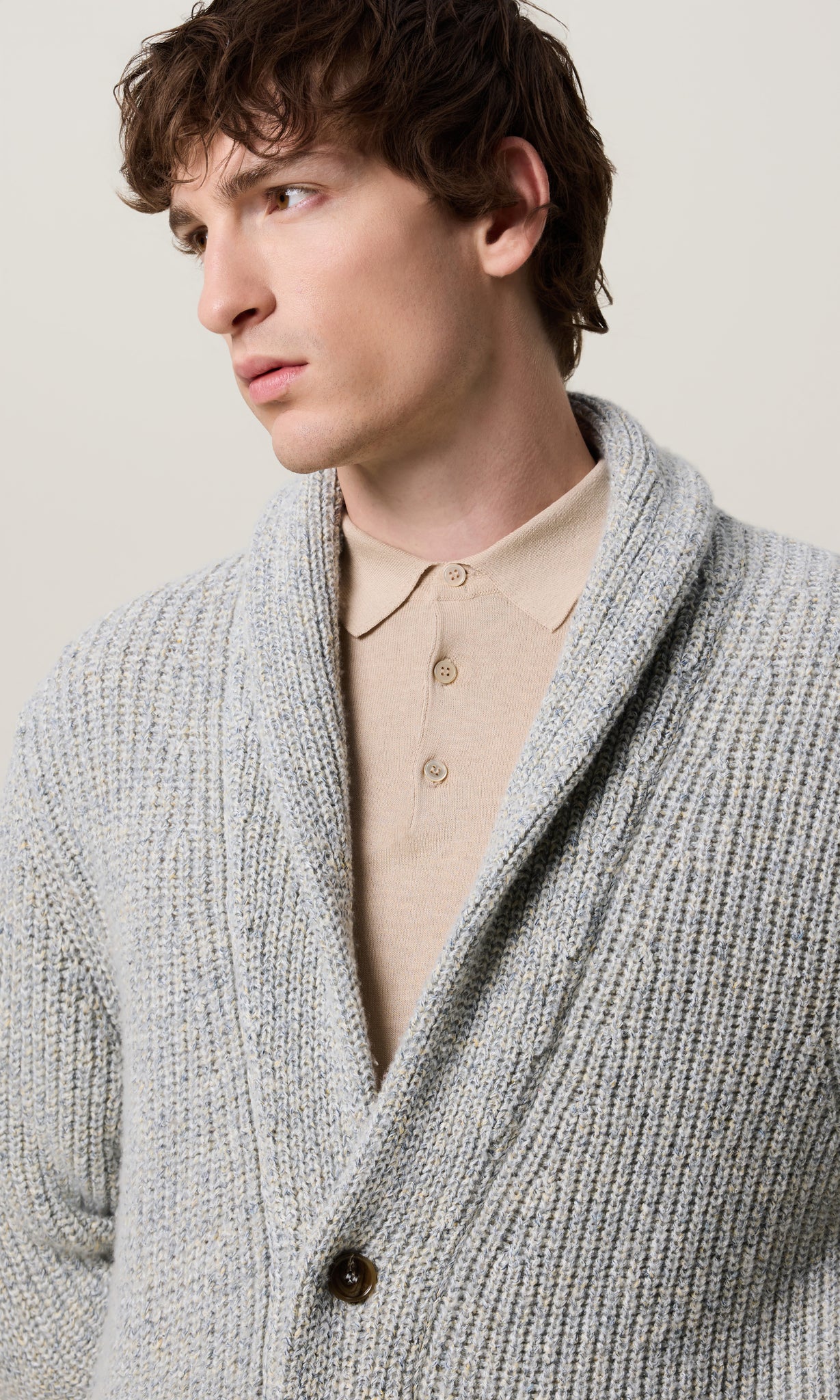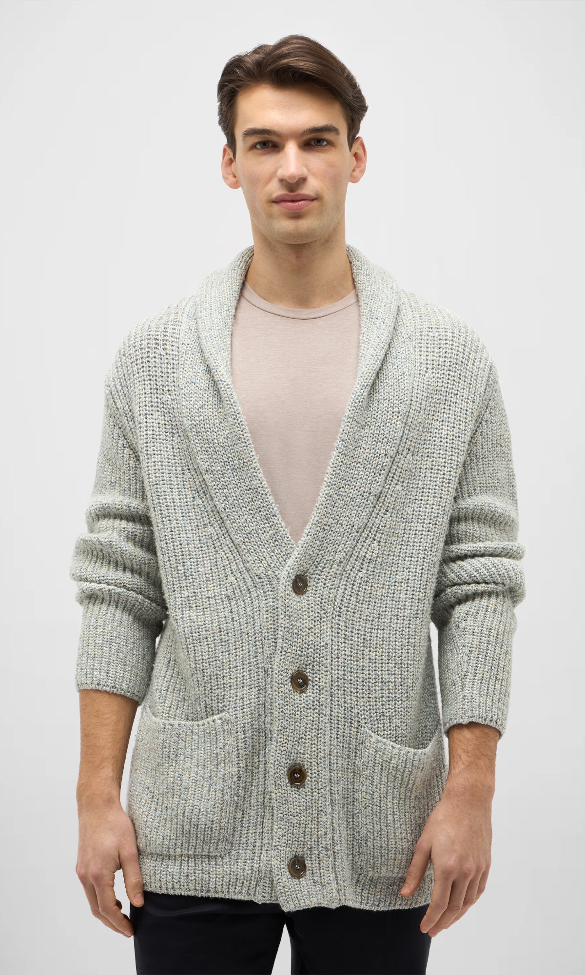 Cardigan calato lavorato in un punto tridimensionale che valorizza la particolarità del filato stampato, esaltandone le sfumature e la profondità visiva.