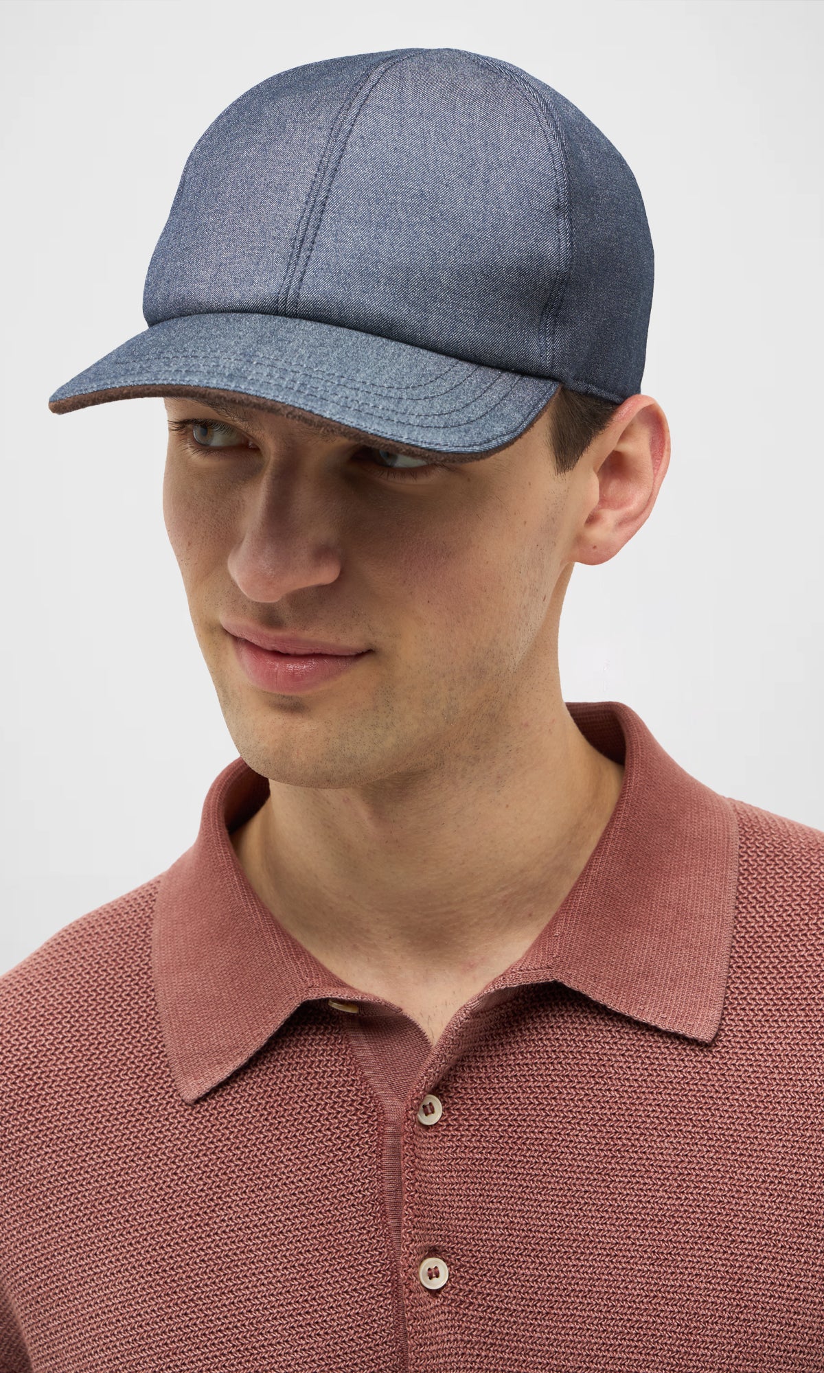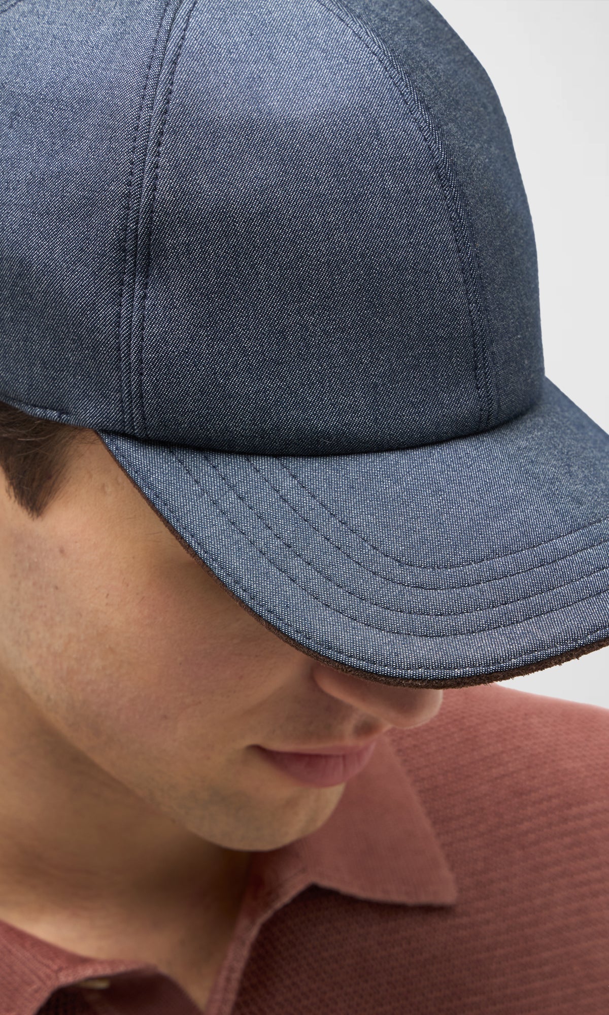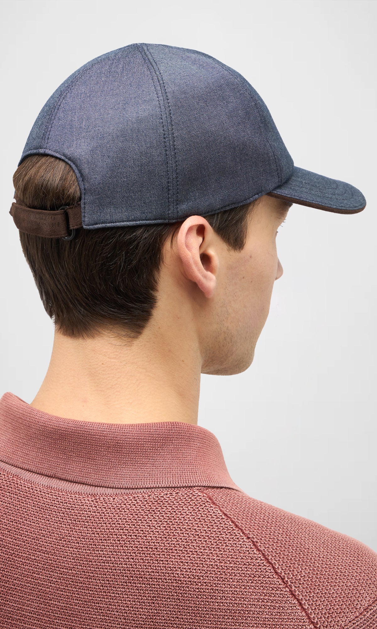 La visiera è valorizzata da un piping in suede moka che definisce l’intero profilo.
