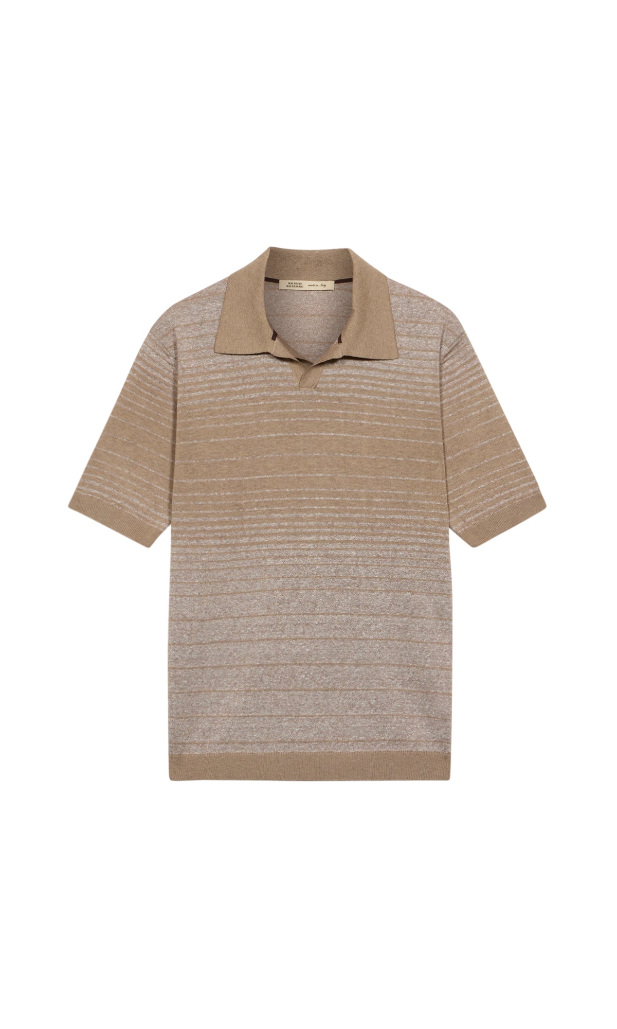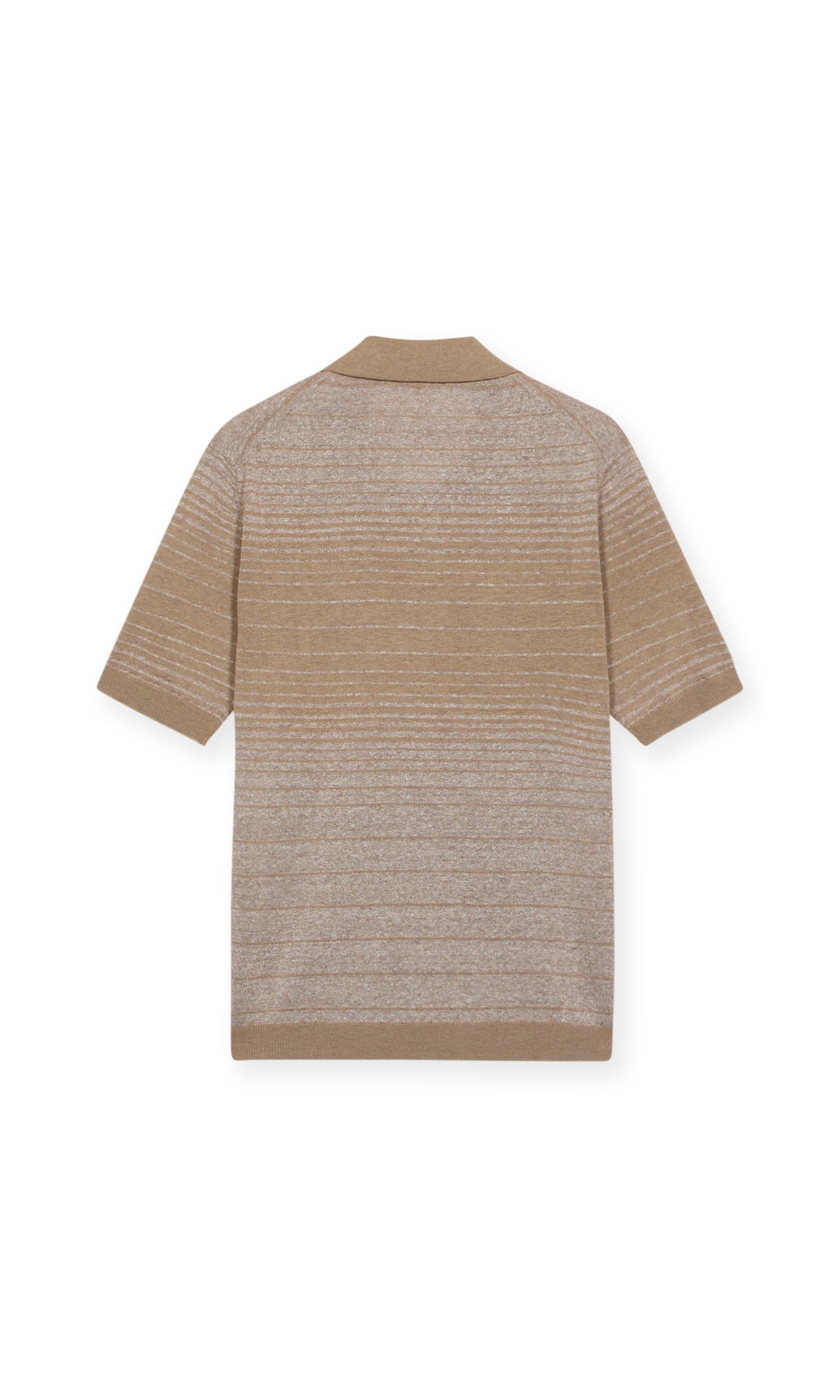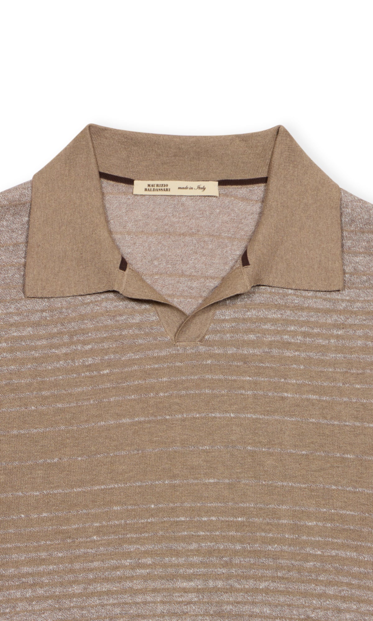 Polo rigata senza bottoni realizzata in un filato pregiato di cotone, lino e seta.