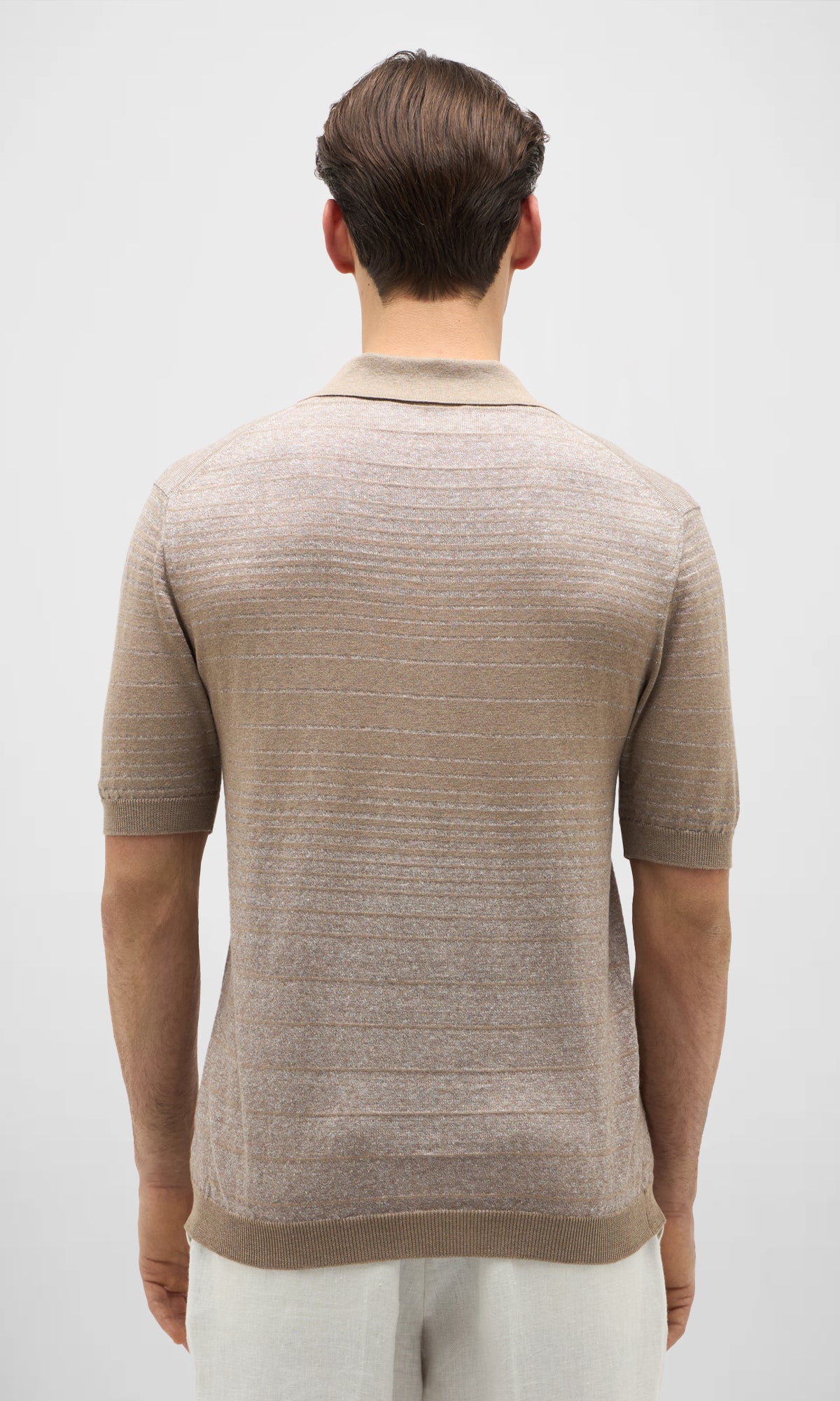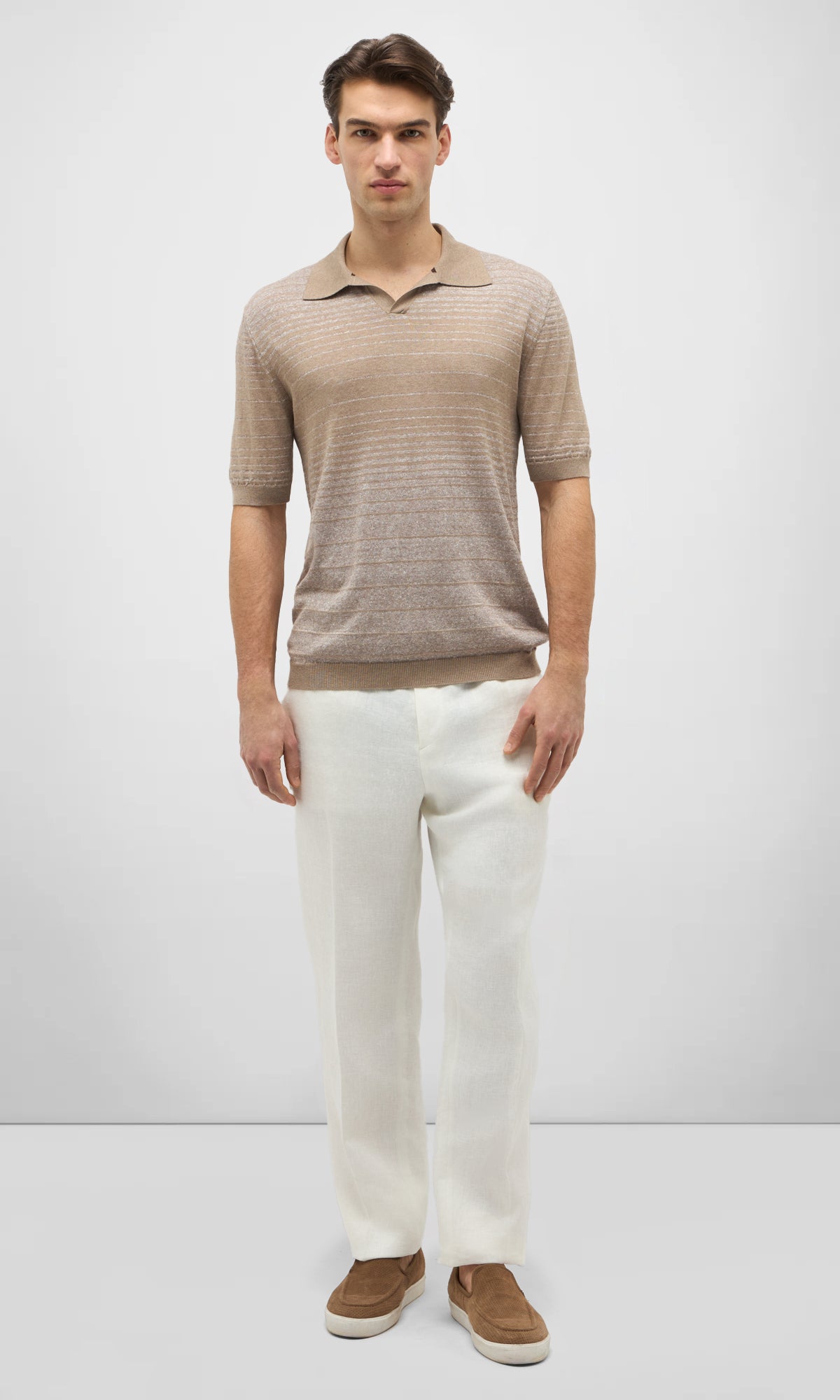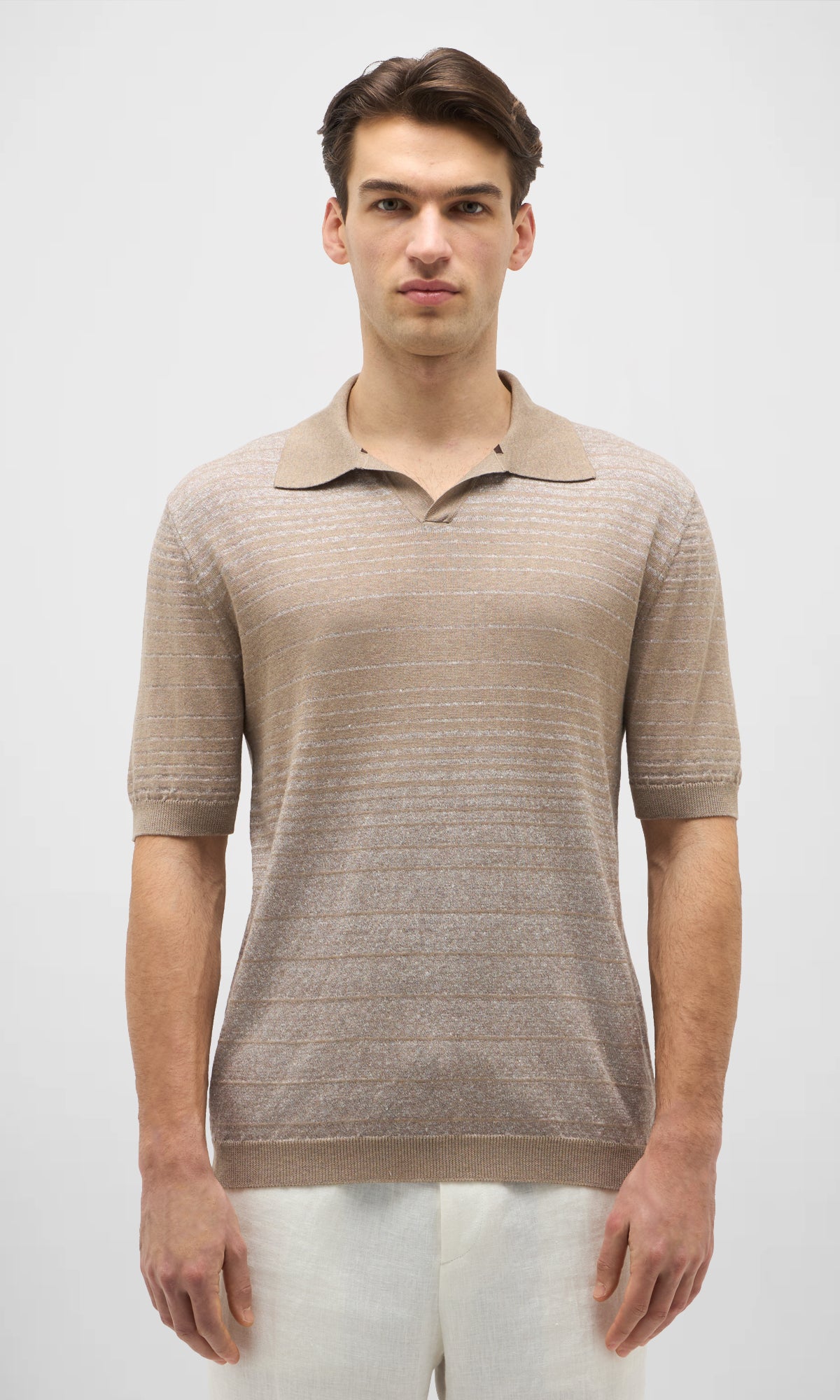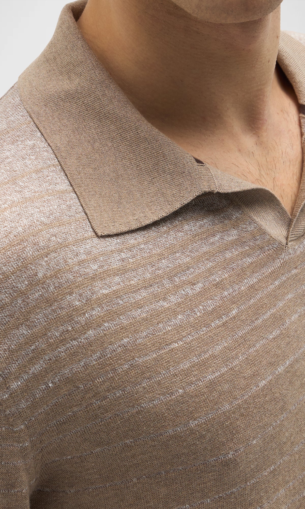 Polo rigata senza bottoni realizzata in un filato pregiato di cotone, lino e seta.