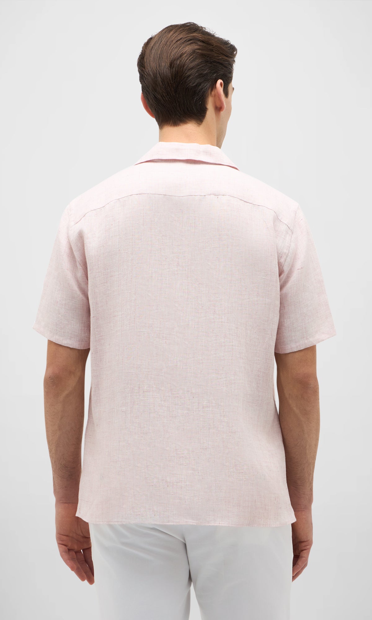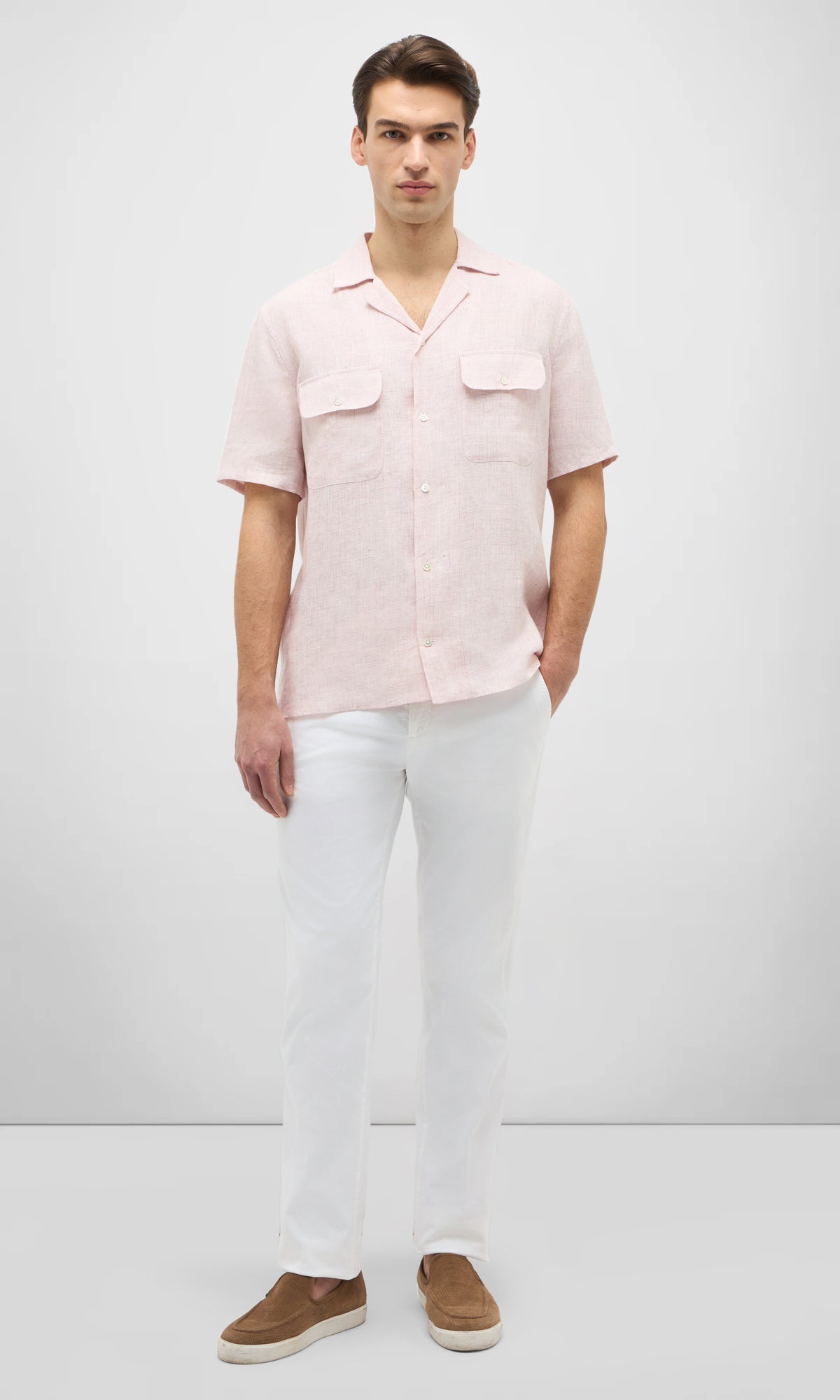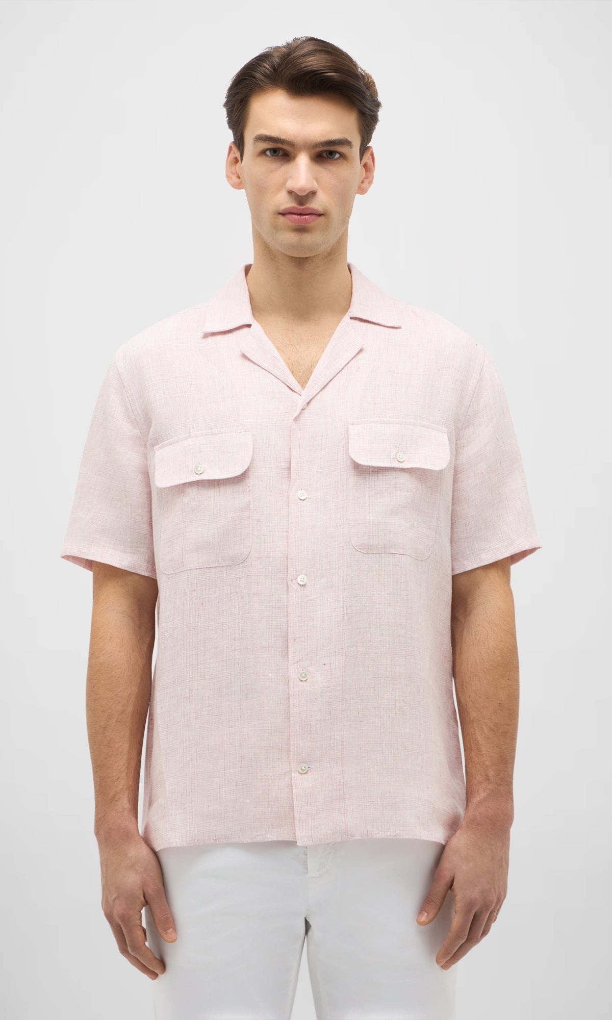 Camicia bowling a manica corta realizzata in puro lino con una leggera fiammatura che ne esalta l’aspetto naturale e informale.