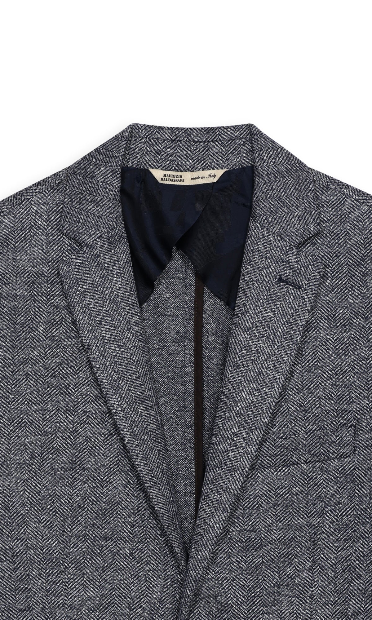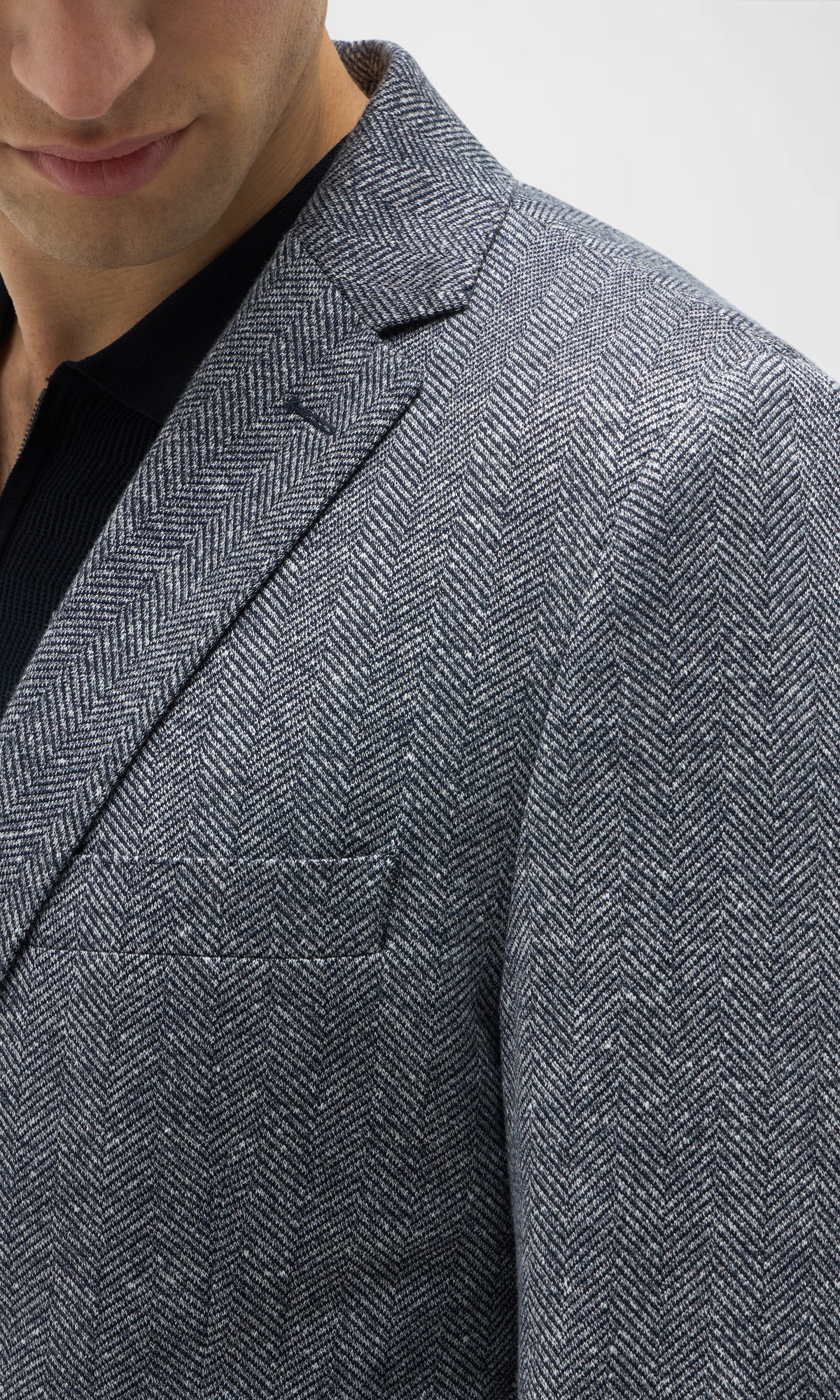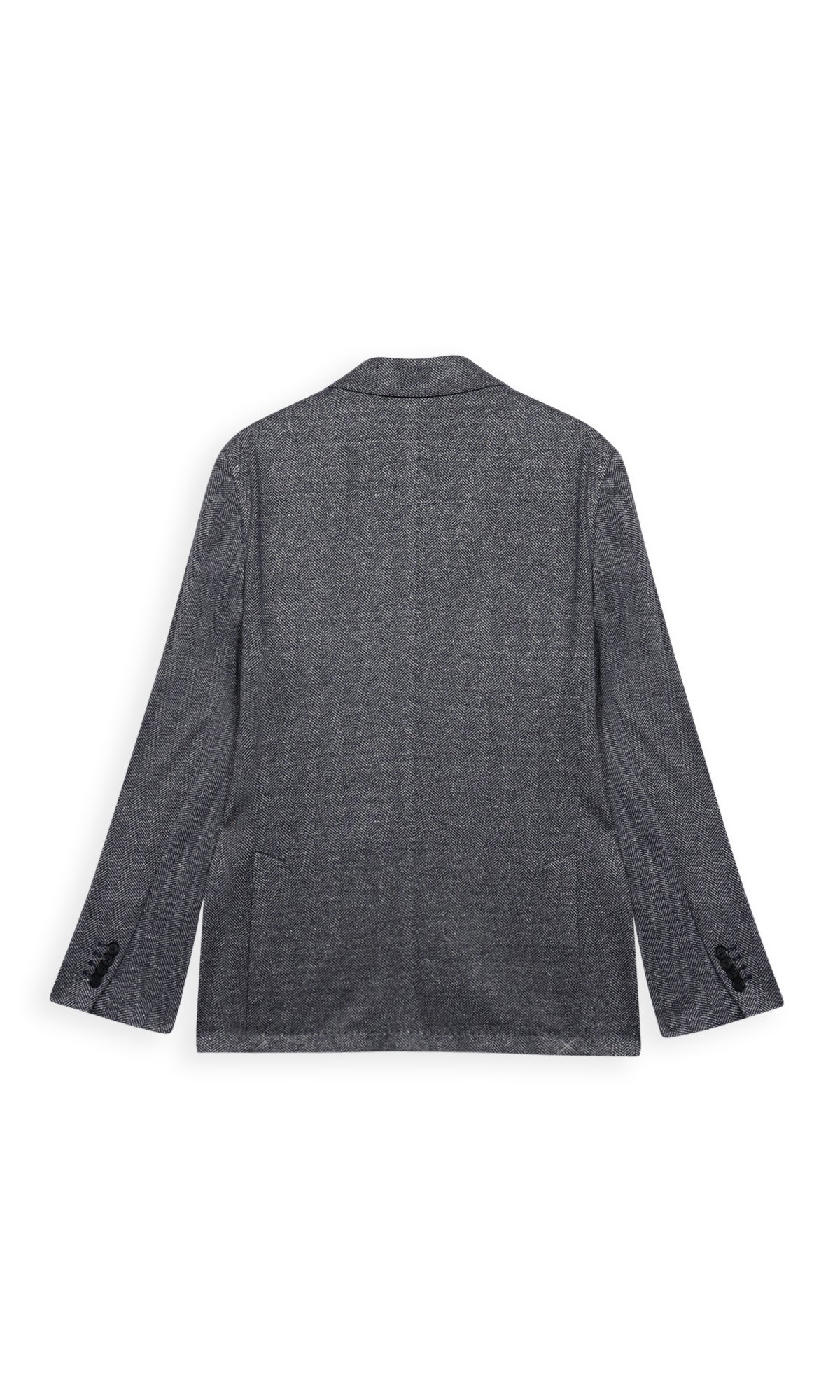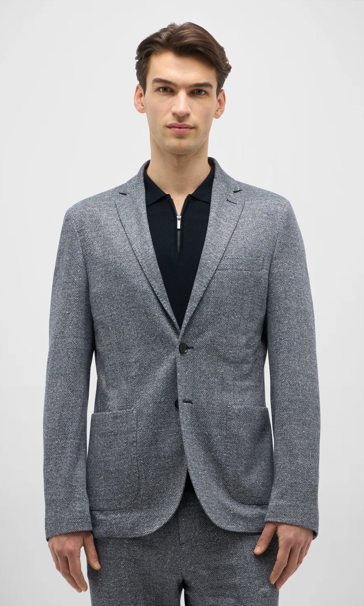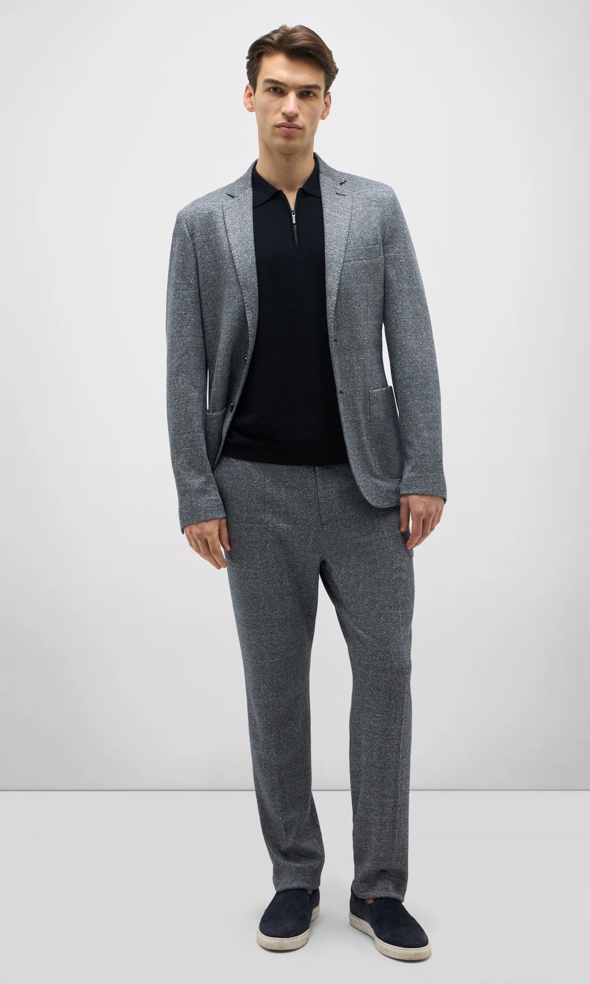 La trama spina di pesce, ottenuta dall’intreccio di due fili di colore diverso, conferisce al capo un carattere più informale e versatile.